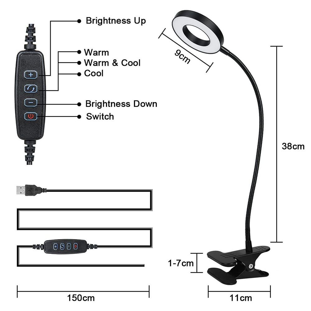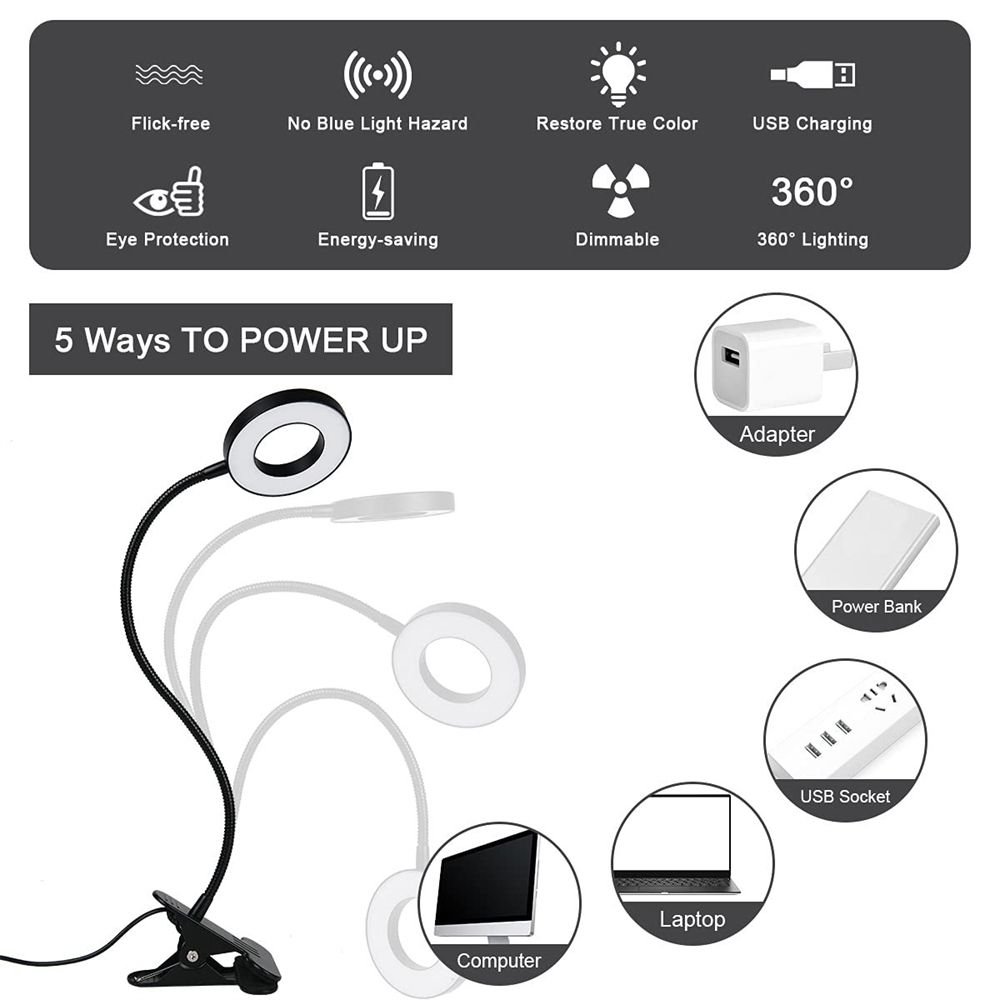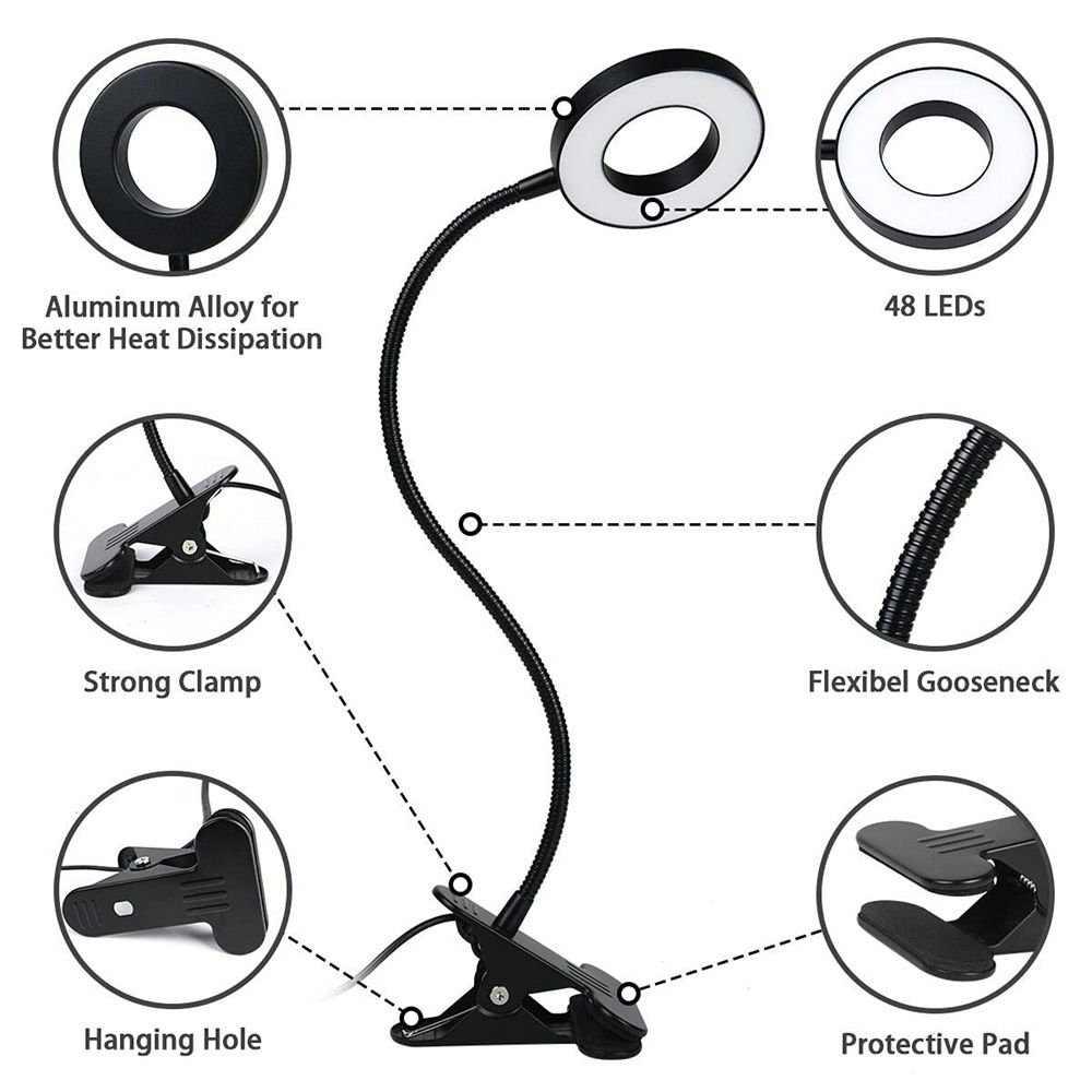 1.LED clip lamp easy to install : The clip with foam protection pad has a clamping force of about 9KG (19.8 pounds), which is stable and reliable. the 38cm (15inches) gooseneck tube with a silicone protective sleeve can be bent and adjusted according to your needs to find the most suitable light angle. suitable for students to learn , adult reading, office work, diy, maintence, dressing table, il art, travel, tent, selfie light, video light, desktop /laptop keyboard lighting etc