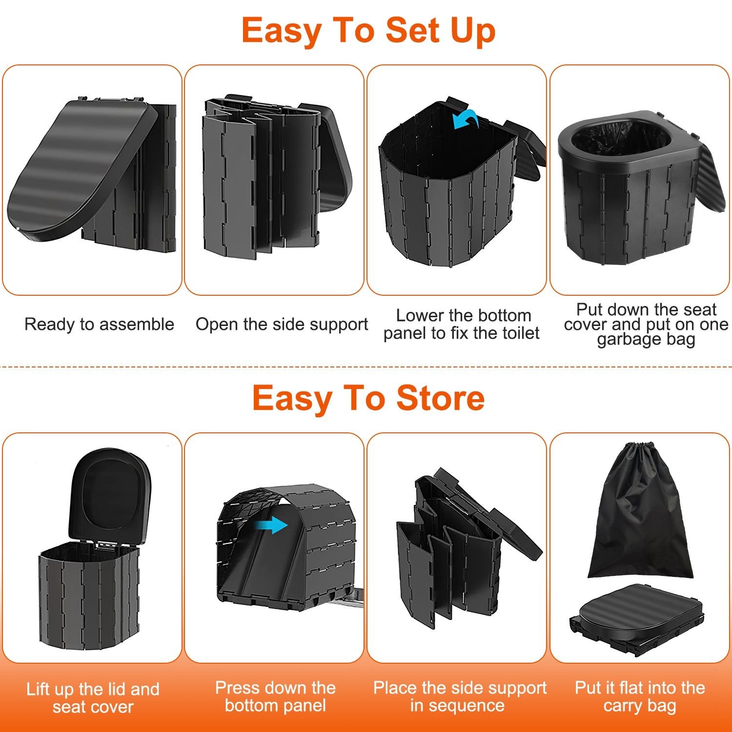 Easy Assembly & Storage: Just Open the side support, lower the bottom panel to fix the toilet, put down the seat cover and put on one of our included garbage bags. When finish, lift up the lid and seat cover, press down the bottom panel, place the side support in sequence and put it flat into the provided carry bag with a drawstring preventing falling off.
