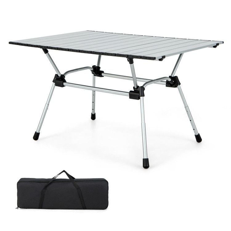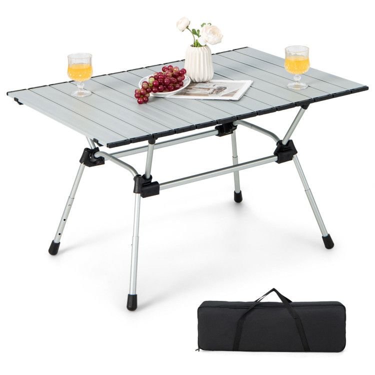 ● Easy and Quick Installation in 3 Minutes: The aluminum camping table with a roll-up tabletop can be easily set up, and all you need to do is take out all parts, extend out the frame and install supporting legs, install 2 side bars, and unroll the tabletop, then adjust the height to the desired position. There are no tools required.