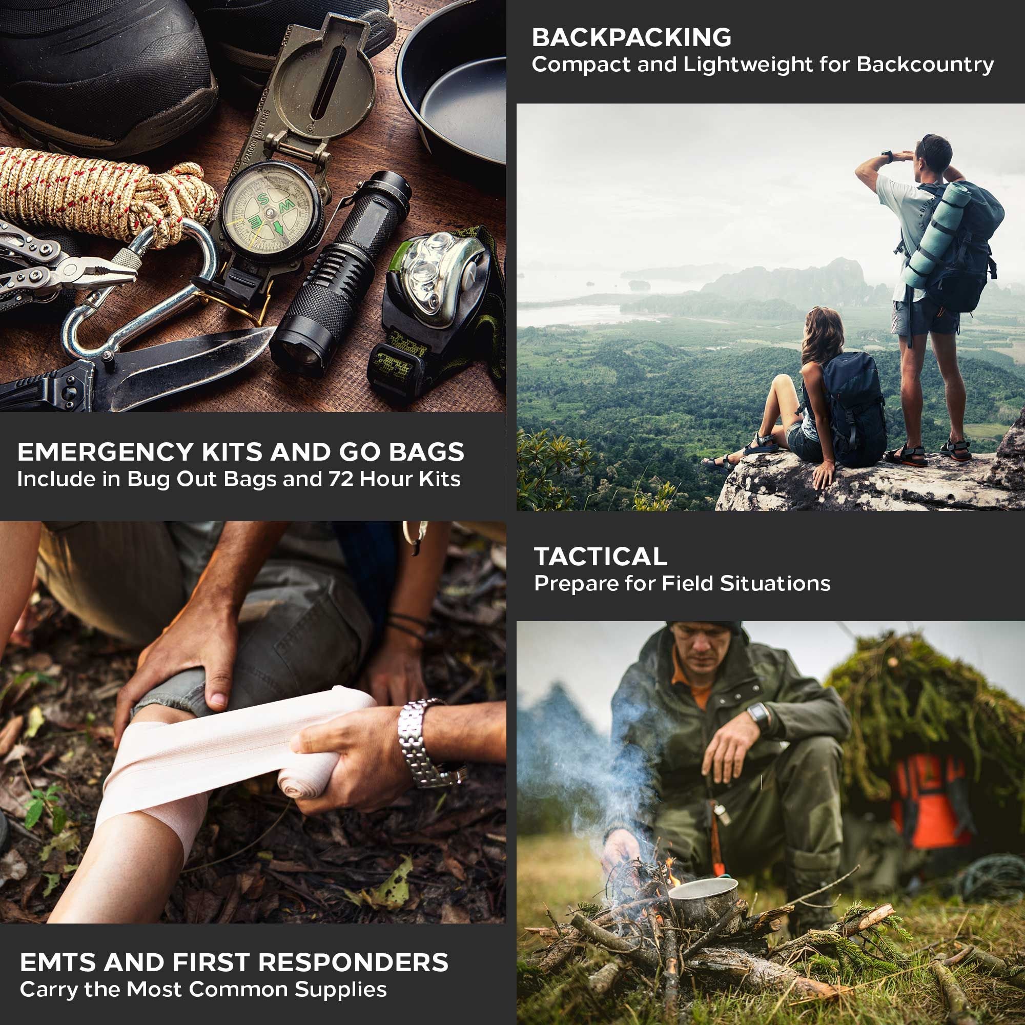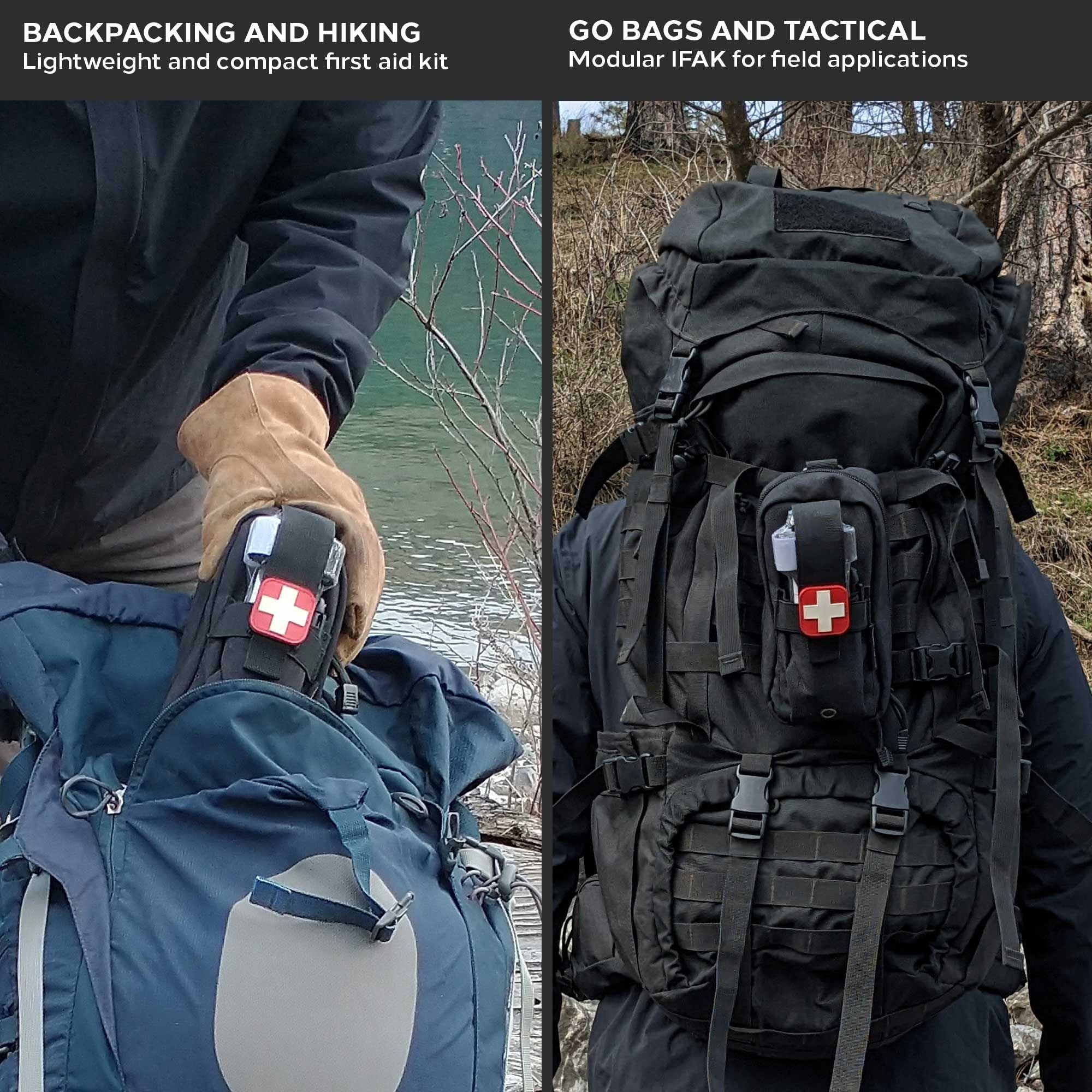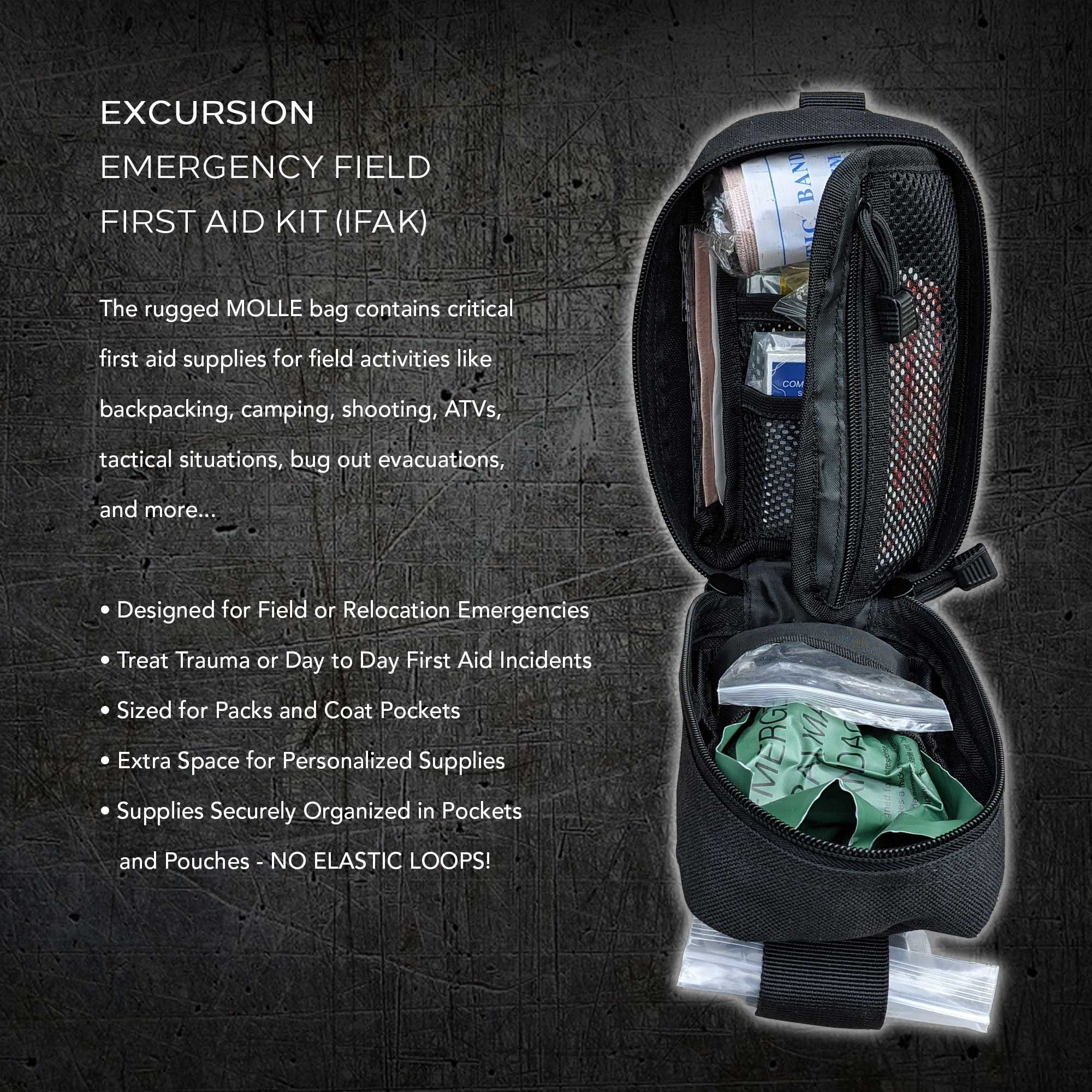 1.[PREMIUM SUPPLIES] The Excursion Compact First Aid Kit (IFAK) was originally designed for bug out bags, 72 hour kits, and emergency kits. We quickly realized it's also an ideal first aid kit for hiking, backpacking, ATVs, camping and other outdoor activities. The first aid supplies are selected to suit many emergency situations. It contains supplies for simple emergencies as well as severe trauma. It's designed to patch you up and help you get home or to a hospital.