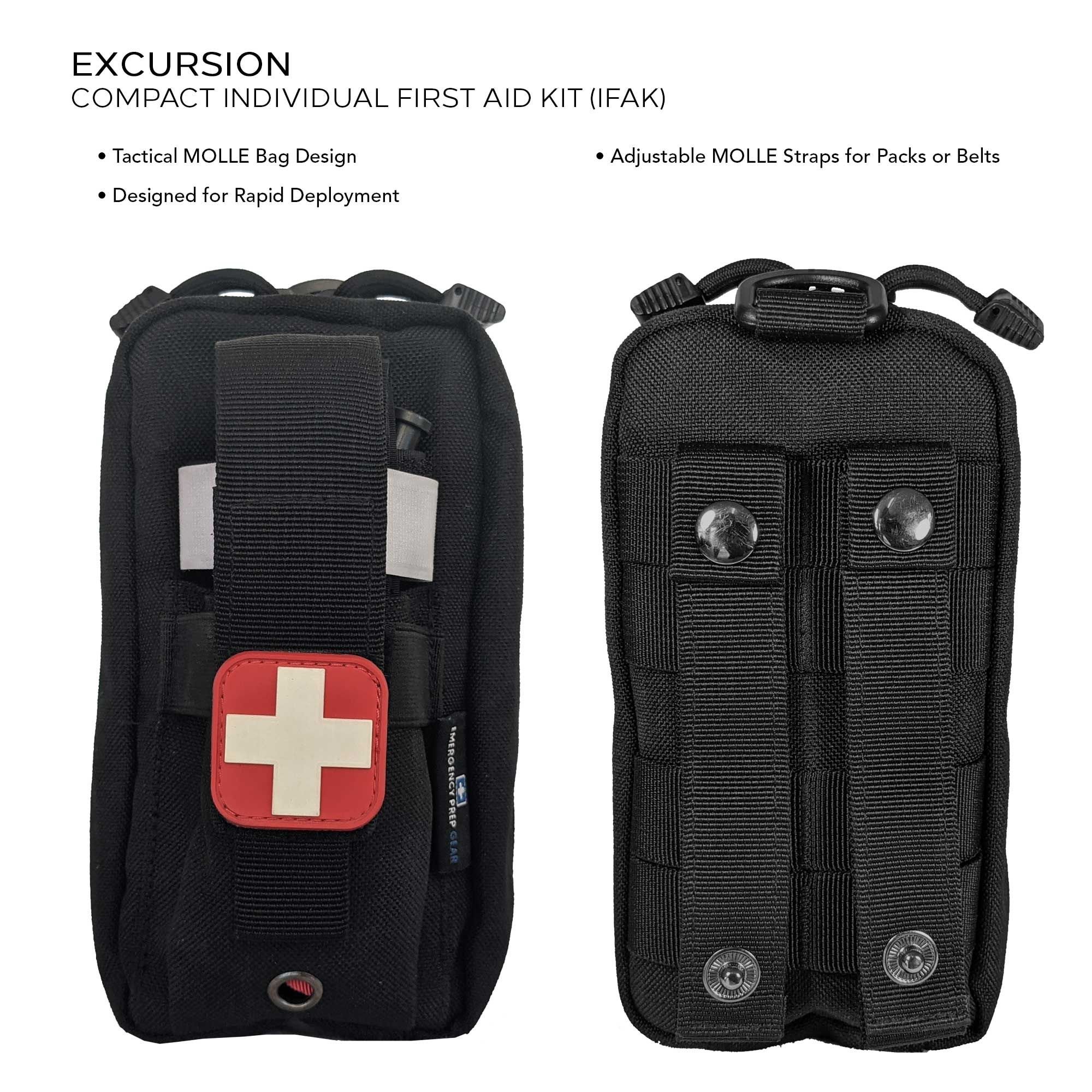 Emergencies and Survival - The Excursion Compact First Aid Kit (IFAK) was designed for bug out bag and 72 hour kit emergencies and survival situations. It features light weight supplies for emergency coverage in field settings. It's designed to help give you a chance to get home or get to a hospital.