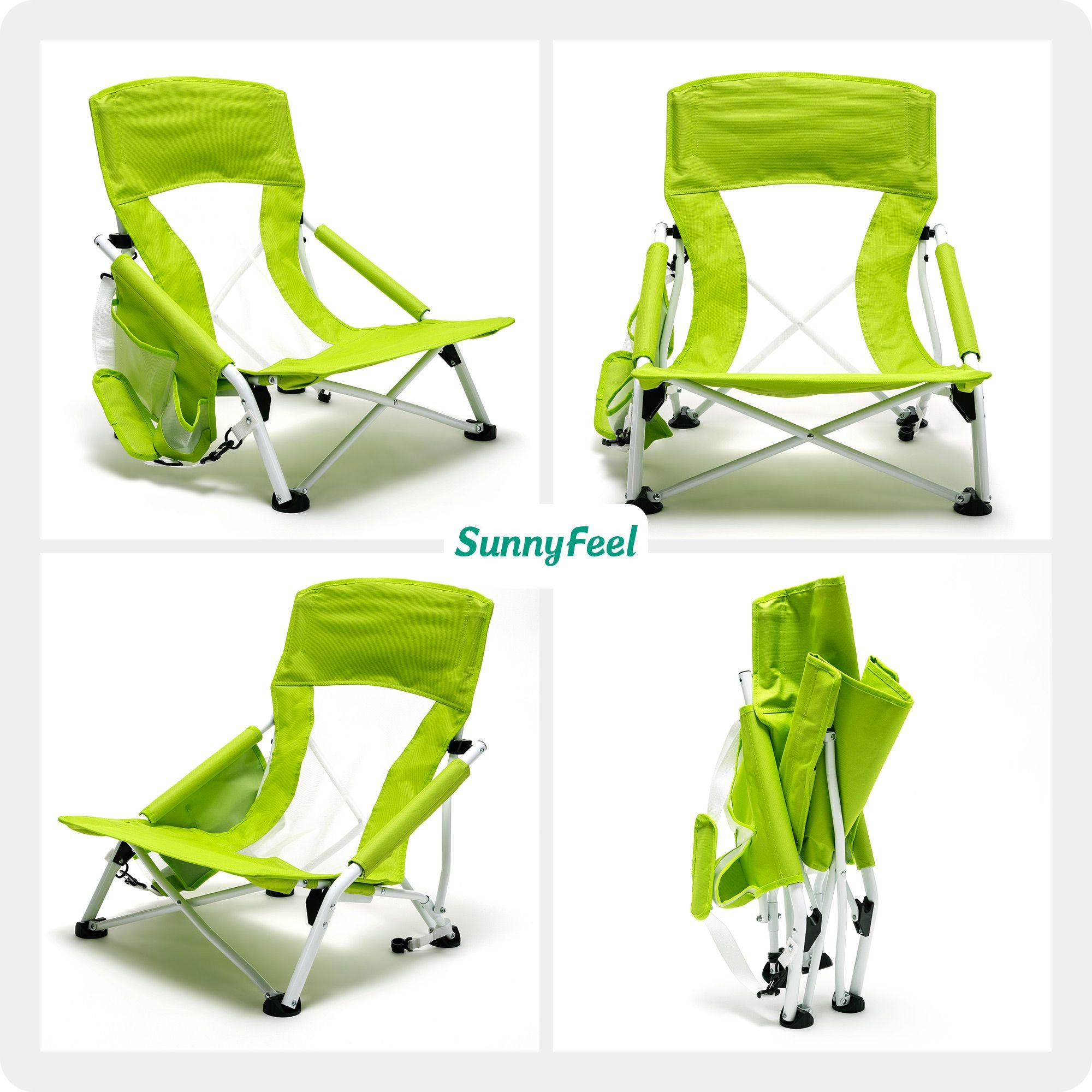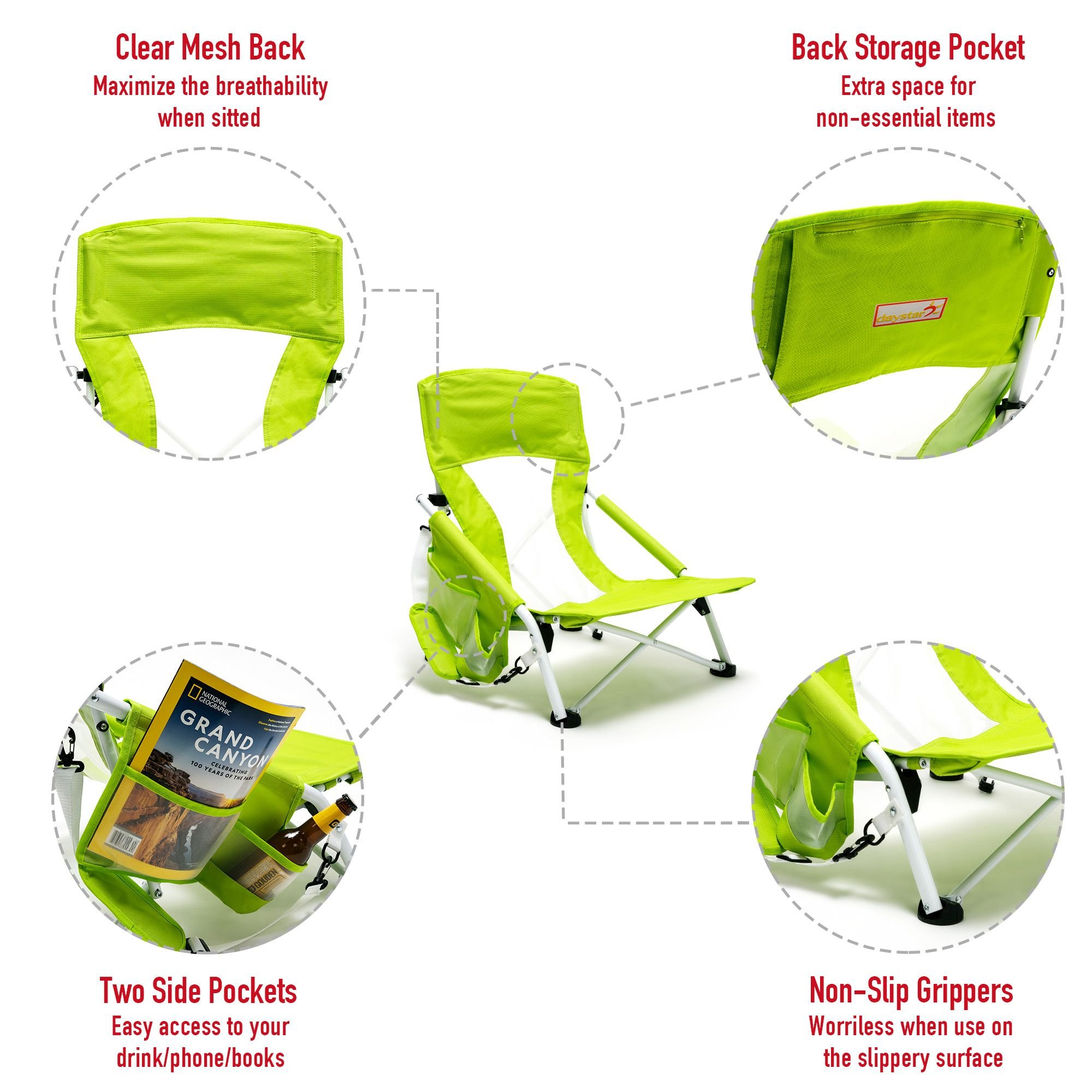 Extremely Comfy & Space Saving: The low seat beach chair seat & anti-sink leg cap & armrest design provide you an ultimate soft seating experience.The breathable and cooling mesh back design makes sitting for long comfortable for you. The small folding size (29×7.5×7 inches) saves your room while not on duty.