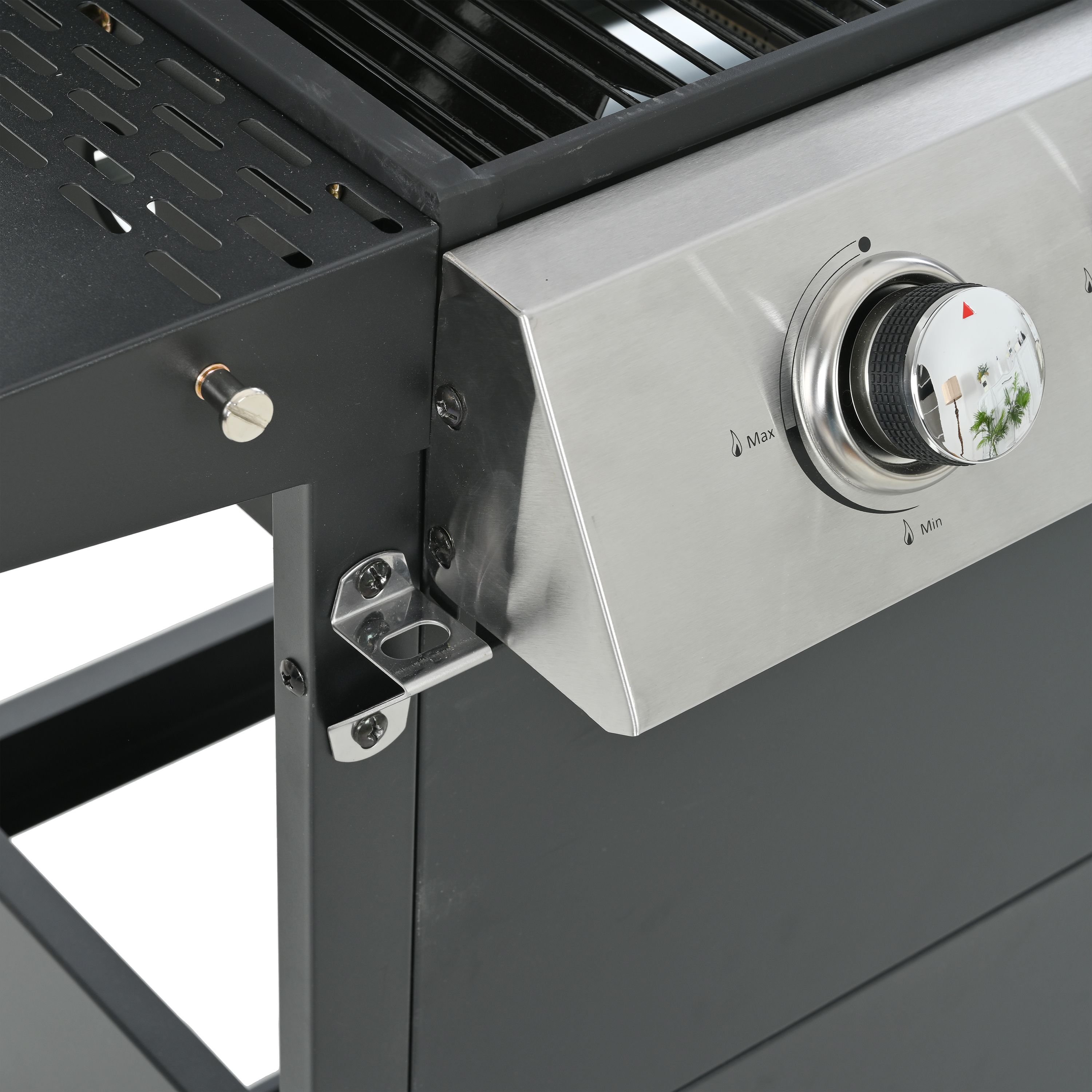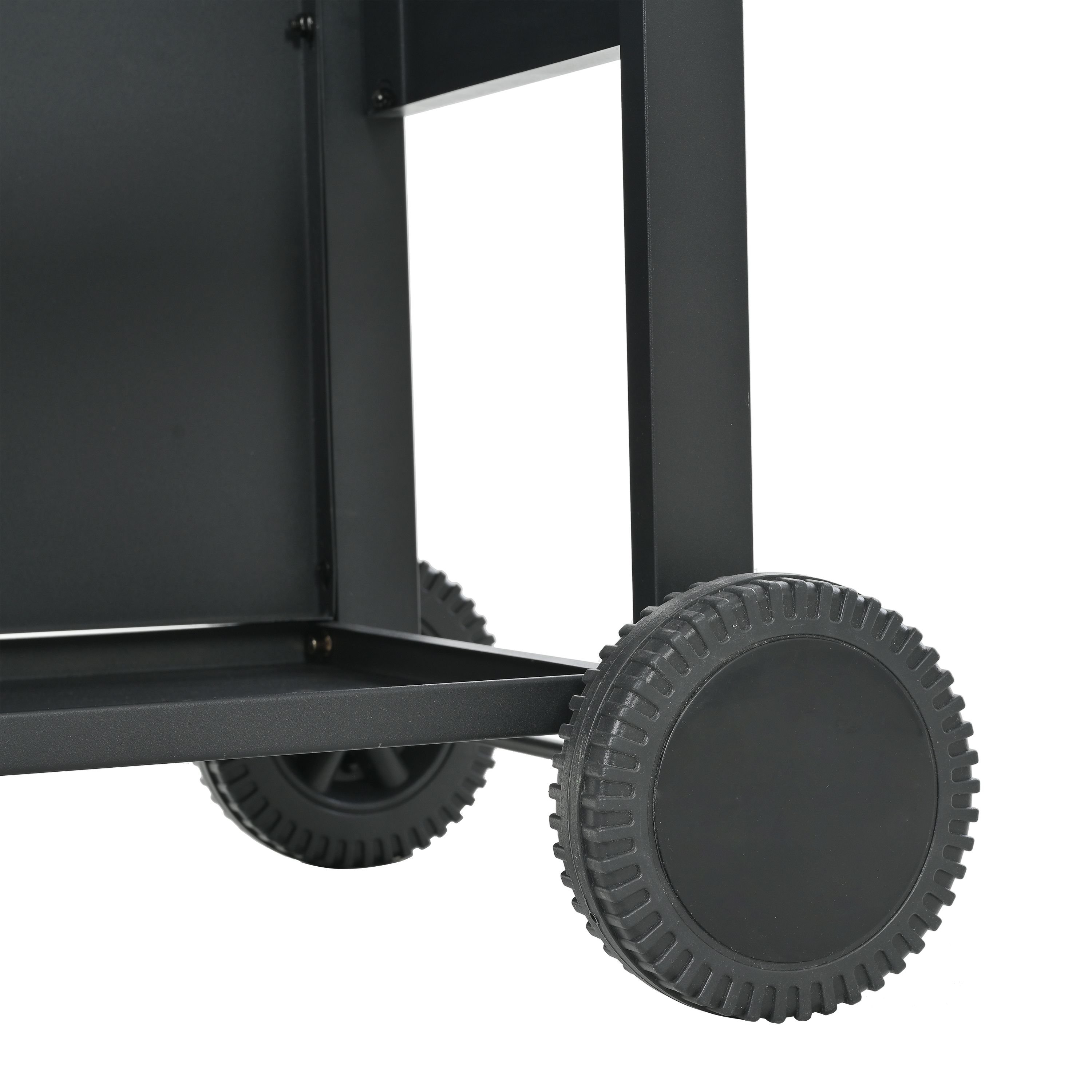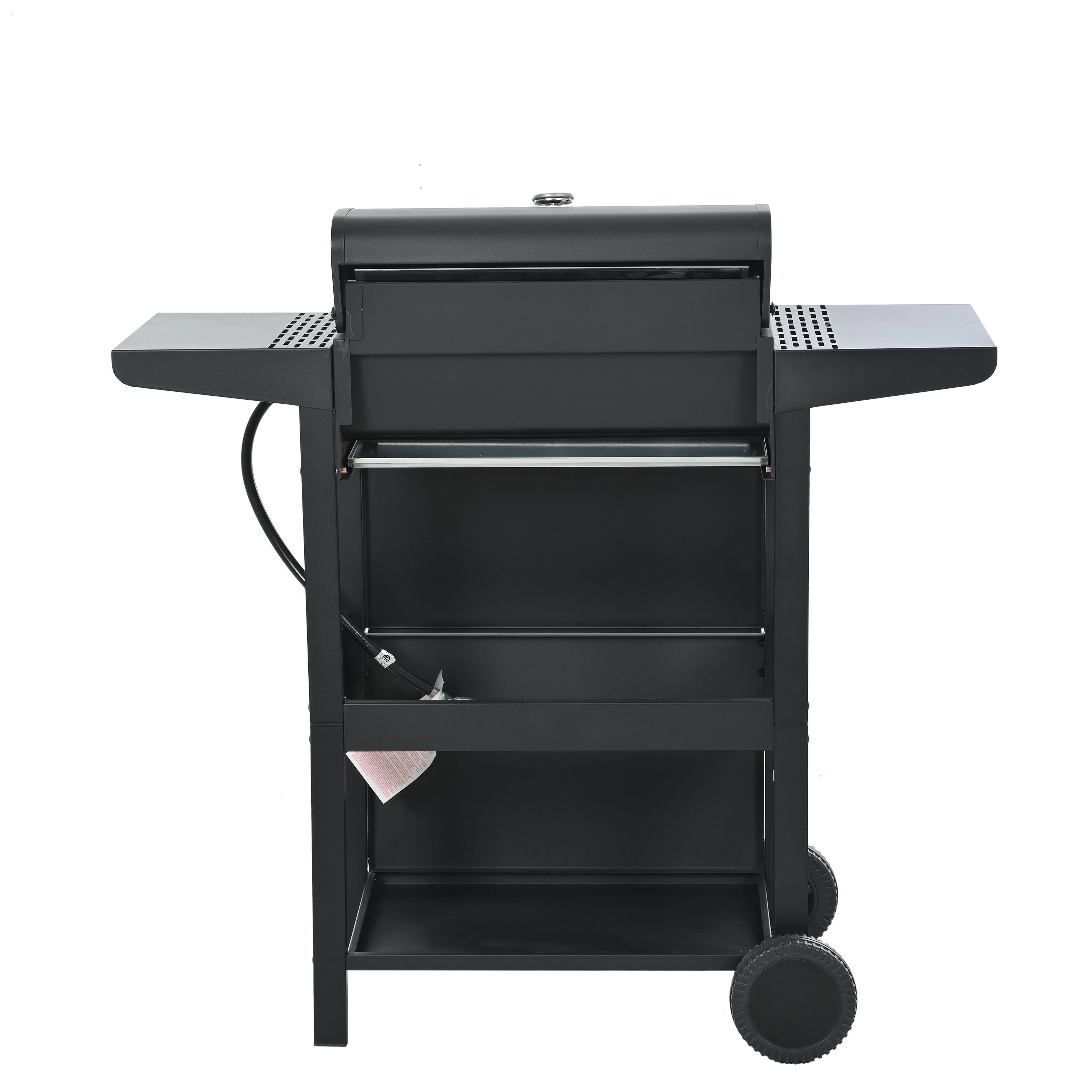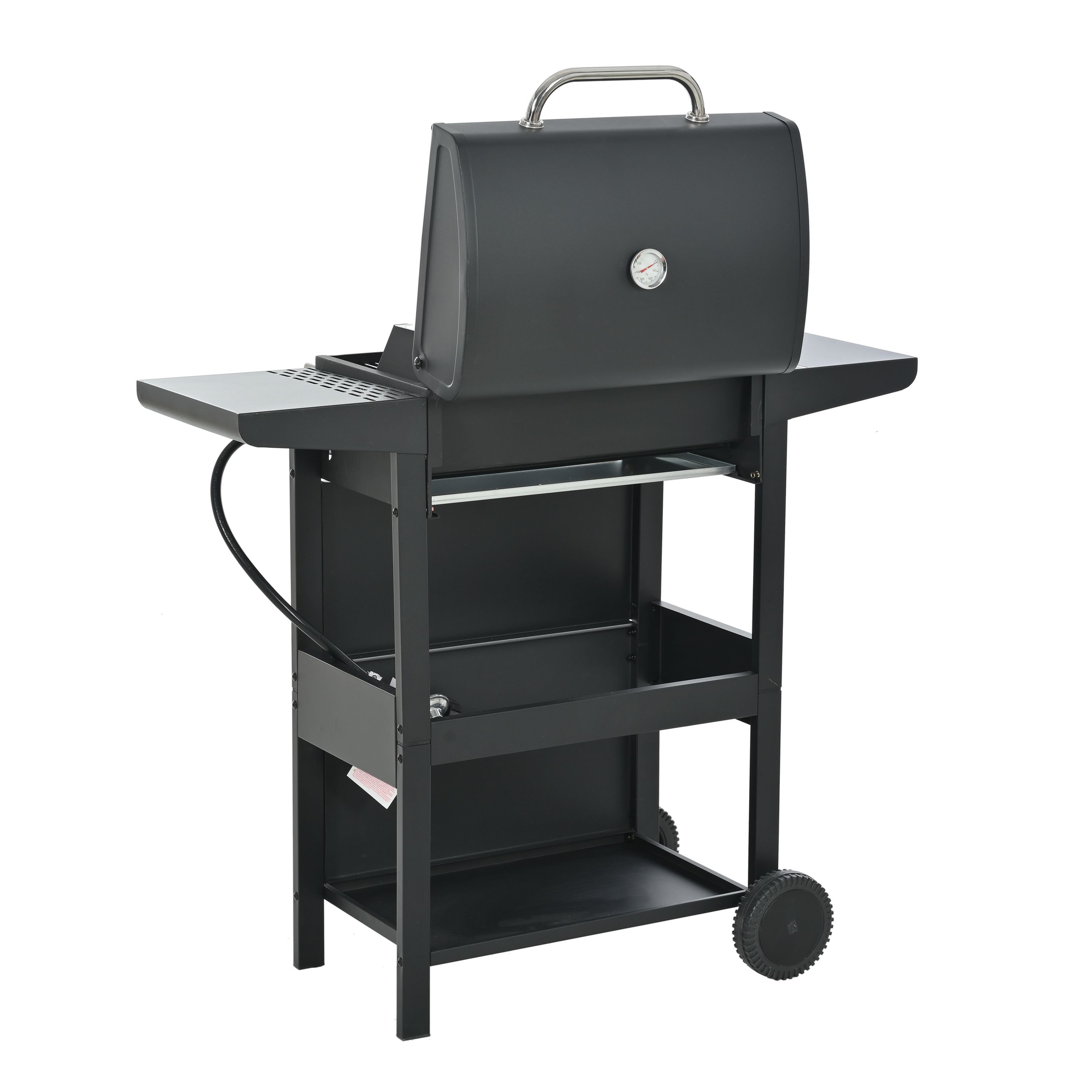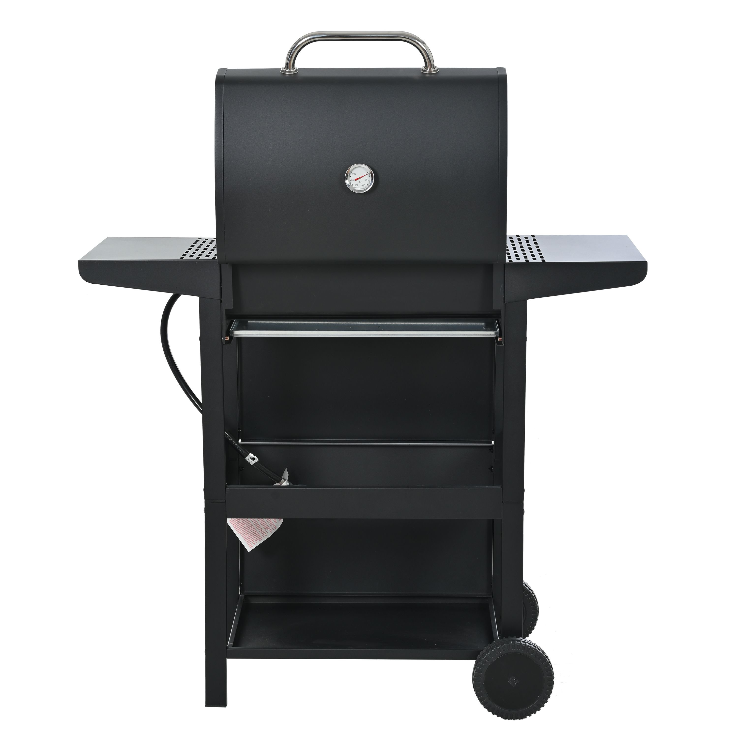 CONVENIENCE: The whole Stainless steel control panel with chromium plating control knob makes this propane gas grill more study and delicate, a stainless steel handle and a built-in stainless steel thermometer on the cover lid, two tables and two wheel casters for storage and moving