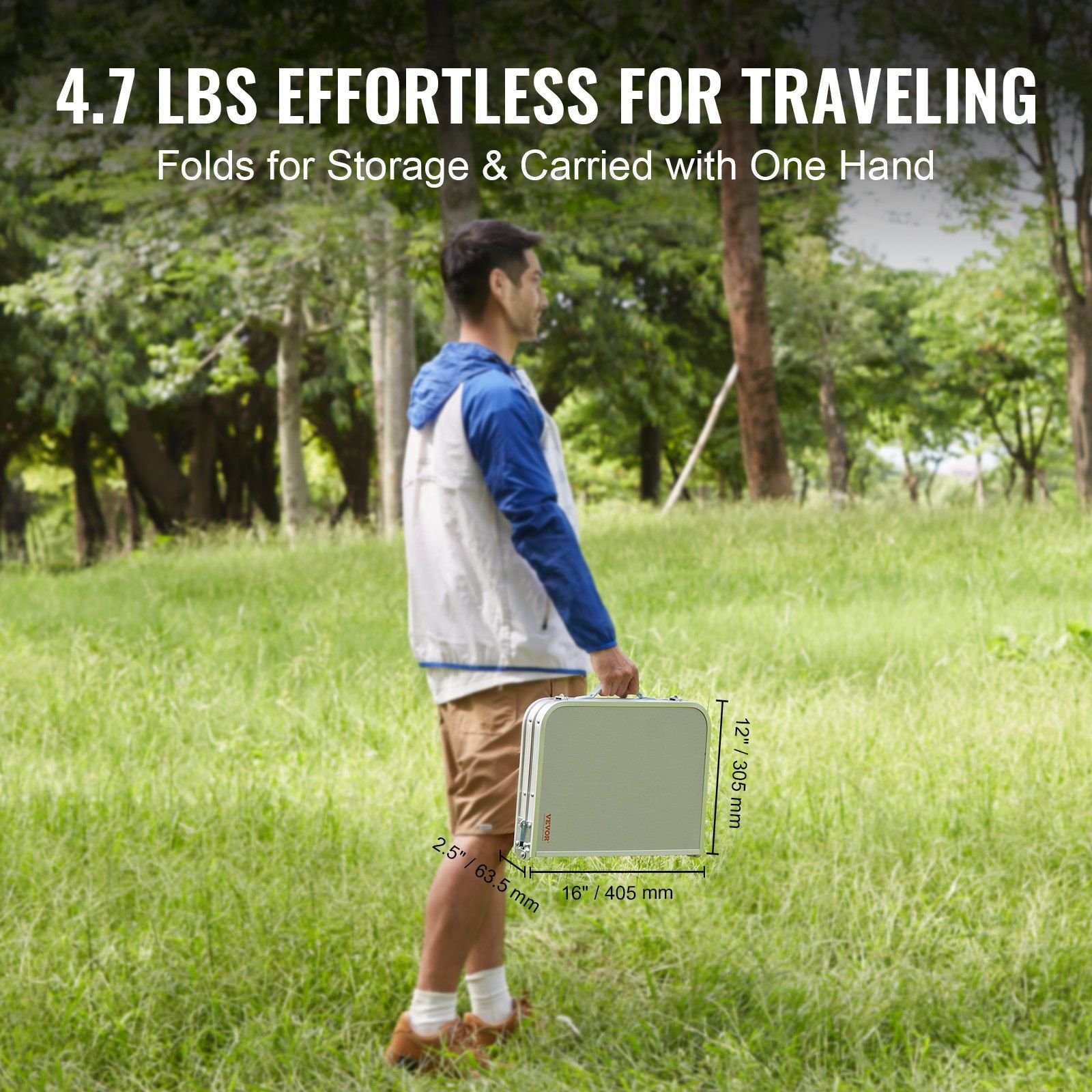 This folding table weighs only 4.7 lbs, making it effortless to carry with just one hand. Its smart folding design makes storage a breeze, occupying minimal space in your vehicle and providing you with endless convenience.